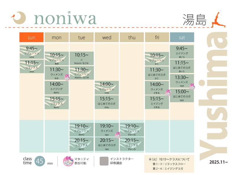 2025年11月より、金町スタジオ、湯島スタジオのタイムテーブルが更新となります。