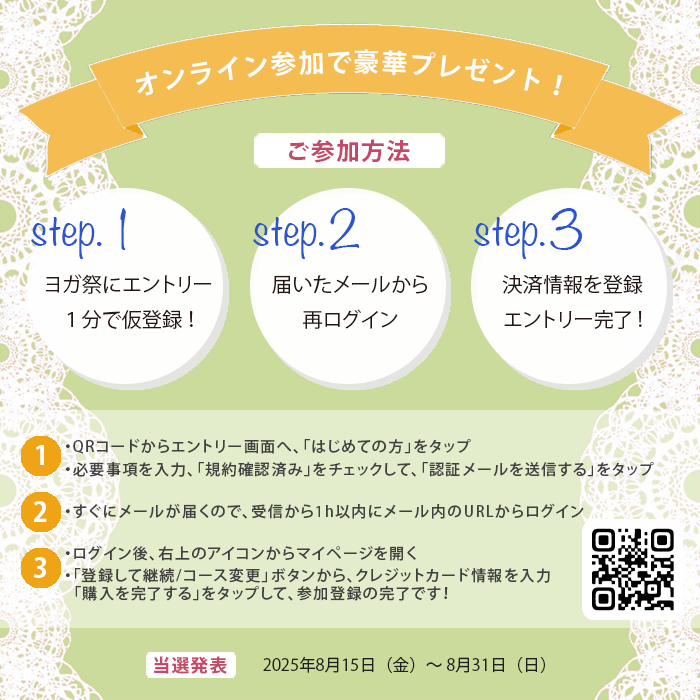 2025年8月15日(金)〜8月31日(日)に、ヨガ祭運営事務局より当選メールをお送りいたします。