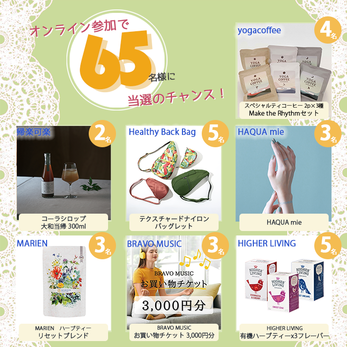 ヨガ祭2025サポート企業16社より、総勢65名さまへのプレゼントです!