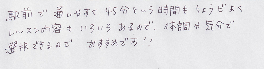 駅前で通いやすく45分という時間もちょうどよく、レッスン内容もいろいろあるので、体調や気分で選択できるので、おすすめです!!