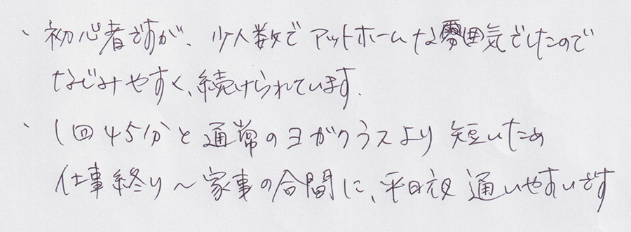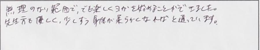 無理ない範囲で、でも楽しくヨガを始めることができました。先生方も優しく、少しづつ身体が柔らかくなればと通っています。