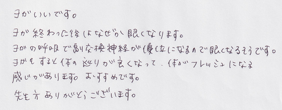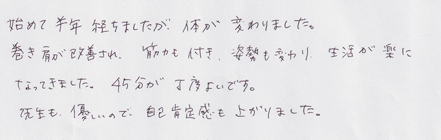 巻き肩が改善され、筋力もつき、姿勢も変わり、生活が楽になってきました。先生方も優しいので、自己肯定感も上がりました。
