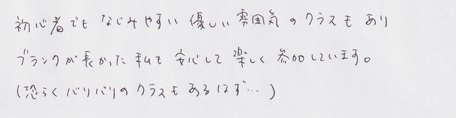 初心者でもなじみやすい優しい雰囲気のクラスもあり、ブランクが長かった私も安心して楽しく参加しています!!