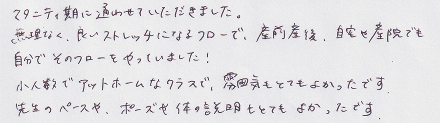 無理なくいいストレッチになるフローで、産前産後、自宅や産院でも自分でそのフローをやっていました!先生のペースや、ポーズや体の説明もとてもよかったです。