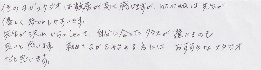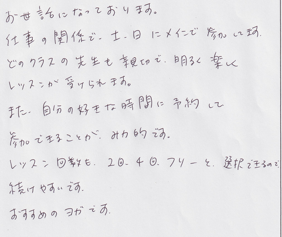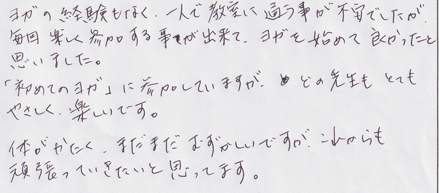「初めてのヨガ」に参加していますが、どの先生もやさしく、楽しいです。ヨガの経験もなく一人で教室に通うことが不安でしたが、ヨガを始めてよかったと思いました。