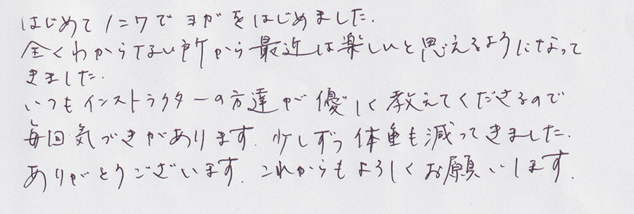 いつもインストラクターの方達が優しく教えてくださるので、毎回気づきがあります。少しずつ体重も減ってきました。