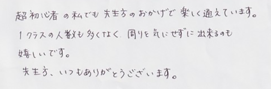 超初心者の私でも先生たちのおかげで楽しく通えています。1クラスの人数も多くなく、周りを気にせずに出来るのも嬉しいです。