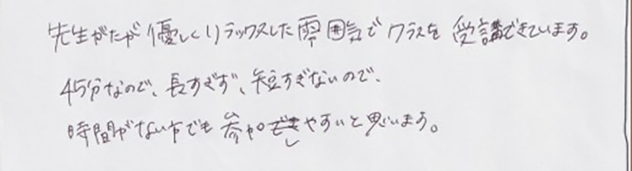 この教室のいいところは、少人数でのびのびなところだと思います。自分の生活のリズムの一部になってきているので、これからも続けたいと思っています。