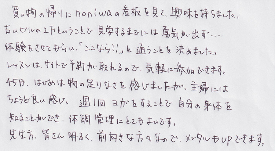 noniwaの看板を見て興味を持ちました。週1回ヨガをすることで自分の身体を知ることができ、体調管理にとてもよいです。